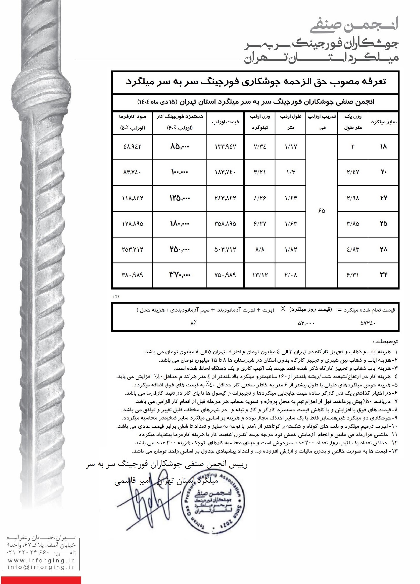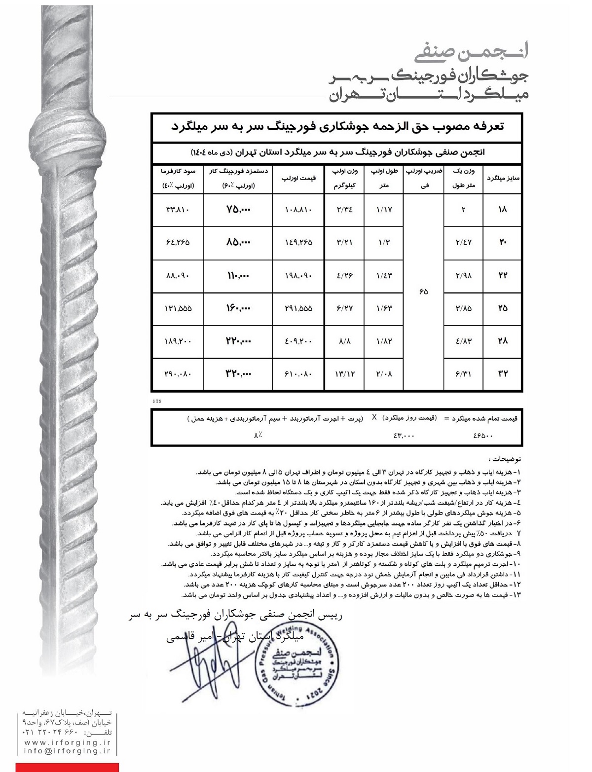 تعرفه مصوب انجمن صنفی جوشکاران فورجینگ سر به سر میلگرد استان تهران - سال1404